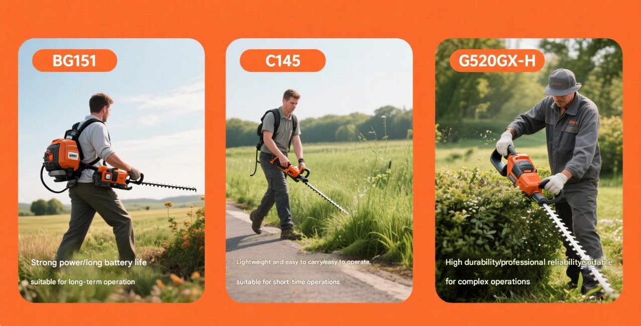 Rugzakmaaier: Rugzak Benzine bosmaaier, zoals BG151 Krachtige knapzak-bosmaaier and BG350A-GX Knapzak 4-takt bosmaaier , heeft een sterk vermogen en een lange levensduur van de batterij, geschikt voor langdurig gebruik en vermindert de last voor de operator.