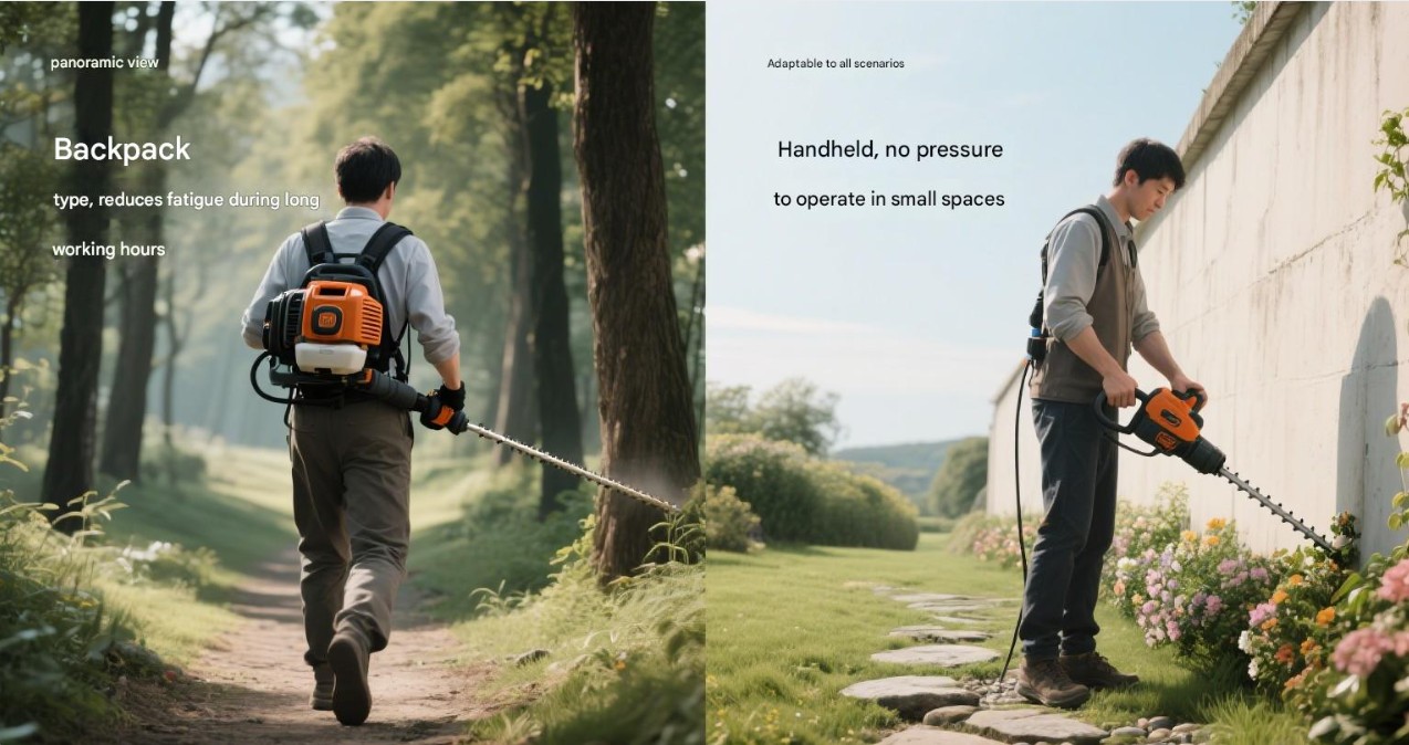 Rugzak- en handheld-ontwerp: benzinebosmaaiers hebben meestal twee ontwerpen, rugzak en handheld, die zich kunnen aanpassen aan verschillende werkomgevingen. Het rugzakontwerp is geschikt voor het snoeien van grote oppervlakken en complexe terreinen, terwijl het handzame ontwerp geschikt is voor het snoeien van kleine tuinen en onkruid langs de weg.