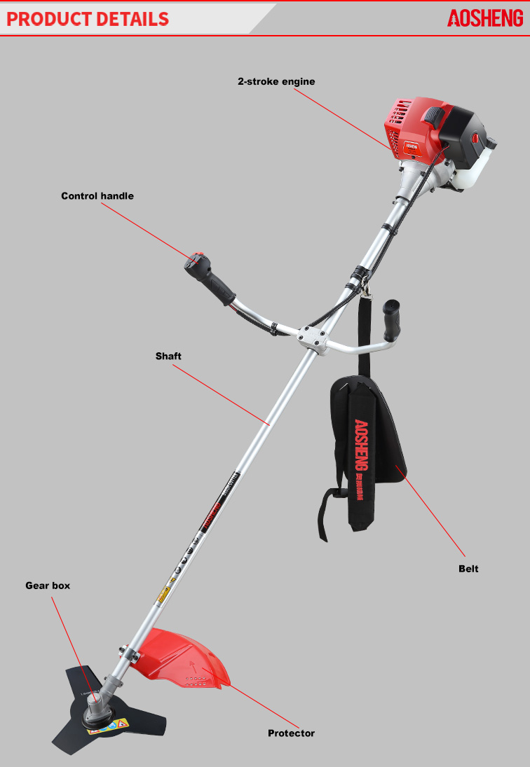 Krachtige motor, cilinderinhoud is 33CC. Professioneel gebruik opent woestenij Buismaat 26 mm * 1,5 mm, sterkte flexibele as. De snijbreedte bedraagt 420 mm Levensduur meer dan 150 uur