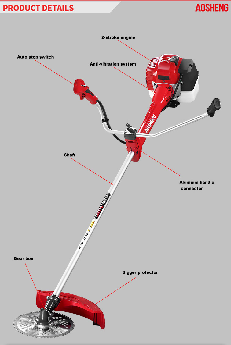 Krachtige motor, cilinderinhoud is 33CC. Professioneel gebruik opent woestenij Buismaat 26 mm * 1,5 mm, sterkte flexibele as. De snijbreedte bedraagt 420 mm Levensduur meer dan 150 uur