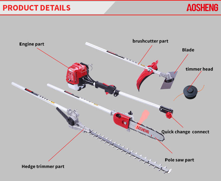 Multi-bosmaaiers omvatten een heggenschaar, een stokzaag en een handmes voor de trimmer.